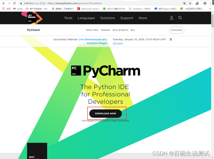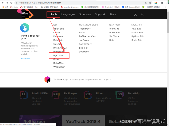 第一步:进入PyCharm官网,点击Tools,如下图所示: