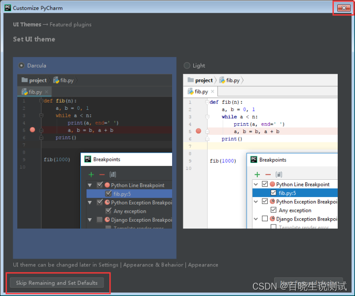 第十二步:可以右上角关掉,也可以左下角:skip remaining and set defaults(跳过其余和设置默认值)