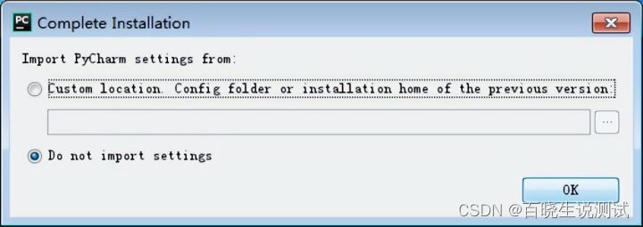 从哪里导入pycharm设置,直接第三个(Do not import settings),以后还可以导入。选择Do not import settings,之后选择OK,进入下一步。