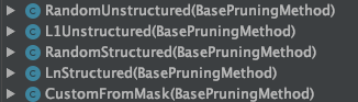 pytorch提供了一个剪枝的抽象基类‘‘class BasePruningMethod(ABC)’,所有剪枝策略都需要继承该基类,并重载部分函数就可以了