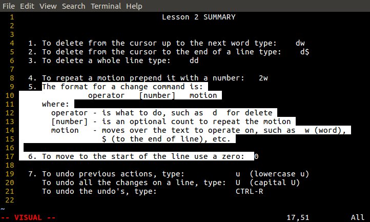 Lesson 2 SUMMARY 1. To delete from the cursor up to the next word type: dw 2. To delete from the cursor to the end of a line type: d$ 3. To delete a whole line type: dd 4. To repeat a motion prepend it with a number: 2w 5. The format for a change command is: operator [number] motion where: operator - is what to do, such as d for delete [number] - is an optional count to repeat the motion motion - moves over the text to operate on, such as w (word), $ (to the end of line), etc. 6. To move to the start of the line use a zero: 0 7. To undo previous actions, type: u (lowercase u) To undo all the changes on a line, type: U (capital U) To undo the undo's, type: CTRL-R