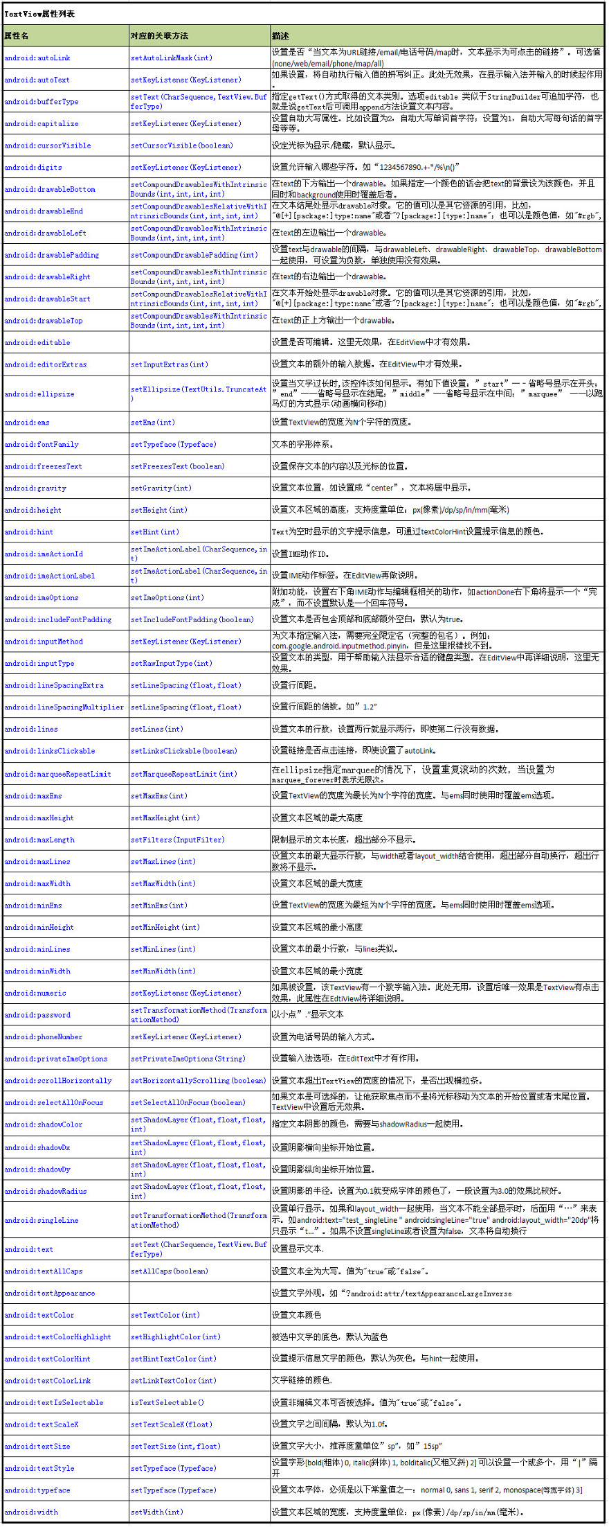 TextView是Android的文本显示器,主要用于文本显示。Android的TextView提供了许多属性和方法用于显示参数设置,参考下面表格: