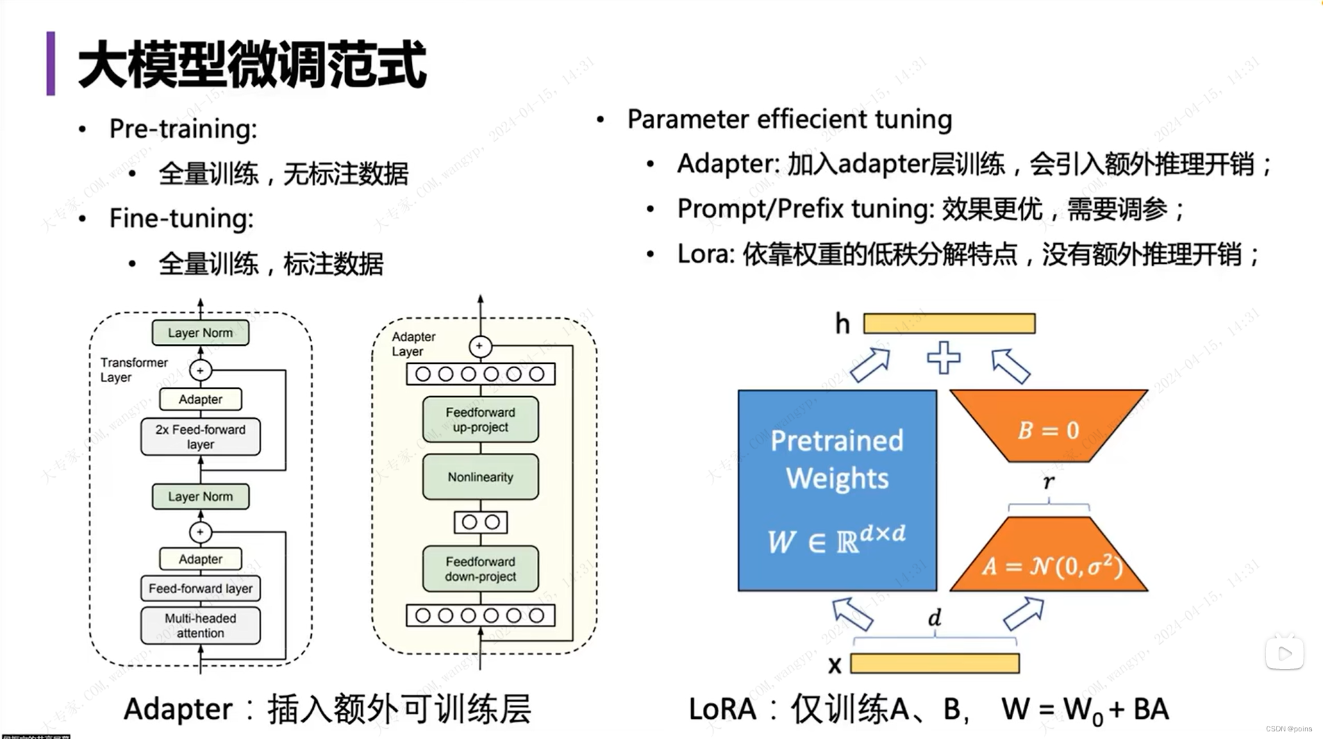 一条是只对部分的参数进行训练,这条路径叫PEFT(Parameter-Efficient Fine Tuning)。