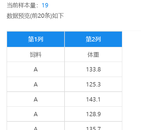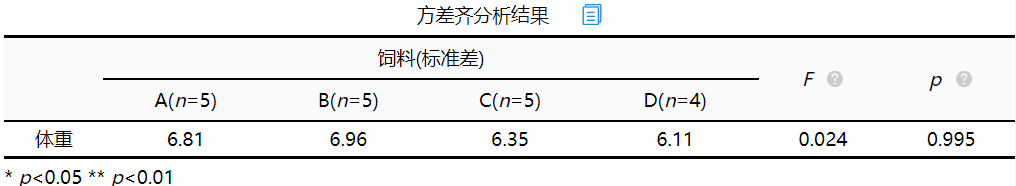 分析方差齐检验是否呈现出显著性主要看p值,如果没有呈现出显著性(p>0.05);直接使用方差分析对比差异,如果呈现出显著性(p<0.05),可考虑使用Welch anova,Brown-Forsythe anova,或者非参数检验研究差异关系,从上表可以看出:p值为0.995大于0.05所以并未呈现出显著性,所以不同饲料样本对于体重全部均有着方差齐性。满足使用方差分析前提要求。