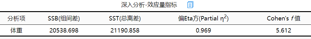 如果方差分析显示呈现出显著性差异(p<0.05),可通过平均值对比具体差异,同时还可使用效应量(Effect size)研究差异幅度情况。一般研究中不用过度关注,如果需要研究差异幅度时可以关注该指标。