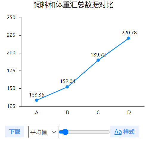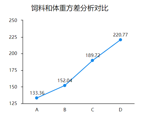 折线图中数值为不同饲料喂养猪的体重均值接连而成的,从折线图可以看出,不同饲料喂养猪是有明显差异的,从图片可以看出饲料D喂养的猪比较重。这表明饲料与猪的体重有一定的关系。