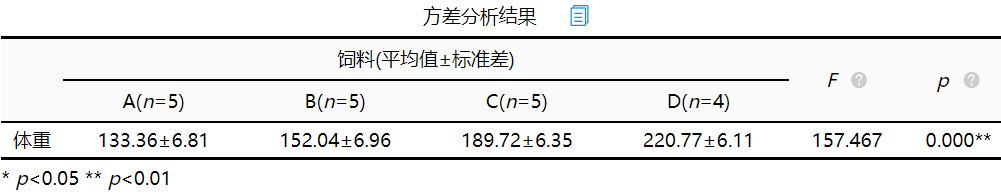 分析X与Y之间是否呈现出显著性(p值小于0.05或0.01);如果呈现出显著性;通过具体对比平均值大小,描述具体差异所在。从上表可以看出p值小于0.05,所以不同饲料样本对于体重全部均呈现出显著性差异。及具体对比差异可知, 有着较为明显差异的组别平均值得分对比结果为“B>A;C>A;D>A;C>B;D>B;D>C;D> C> B>A”。也就是说研究中D饲料的成效最好。