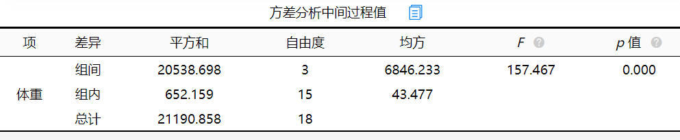 从折线图中可以看出四种不同饲料直接的体重是具体差异性的,而且饲料D效果最好。接下来对方差结果的中间过程值进行描述。