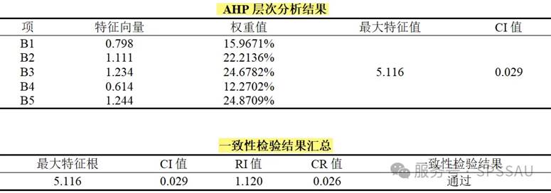 SPSSAU输出层次分析法权重计算及一致性检验结果如下:
