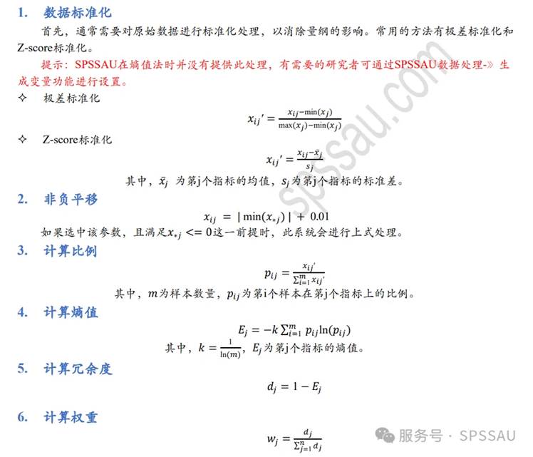 具体的算法公式可点击下方链接查看SPSSAU提供的算法手册,用户可直接下载复制到论文中,熵值法算法手册下载