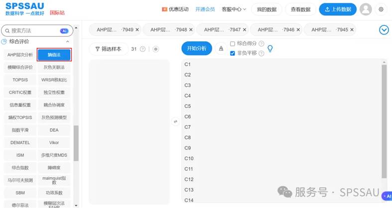 SPSSAU熵值法软件操作:上传数据至SPSSAU平台,将量纲处理后的数据进行熵值法分析,如下图: