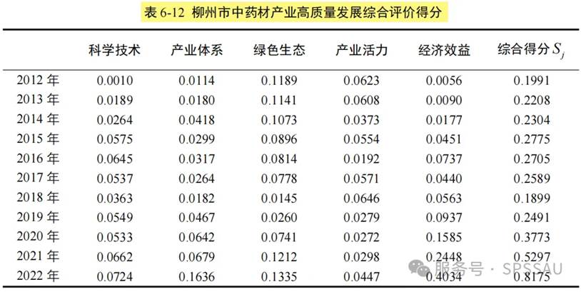 本篇论文通过线性加权求得中药材产业高质量发展的综合评价值,将组合权重与对应的标准化数据相乘并进行累加,最终得到数据即为“综合得分”,计算公式如下: