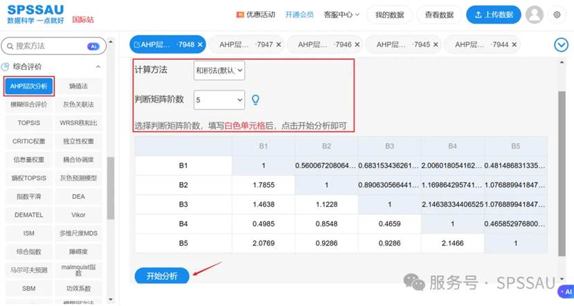 SPSSAU层次分析法软件操作:选择计算方法为“和积法”或“方根法”,选择判断矩阵阶数,填写白色单元格,点击开始分析按钮,操作如下图: