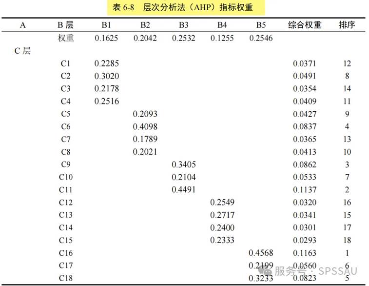 - 最后将准则层权重和指标层权重相乘得到综合权重,整理成下表: