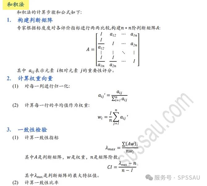 层次分析法可选择“和积法”或“方根法”进行计算,具体的算法公式可点击下方链接查看SPSSAU提供的算法手册,用户可直接下载复制到论文中,免去手动敲公式的麻烦,