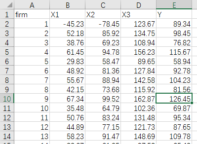 某研究机构收集了100家企业的投入产出数据,希望通过SFA分析评估这些企业的技术效率。数据包括3个投入变量(X1, X2, X3)和1个产出变量(Y)。研究目的是识别技术效率较低的企业,并分析影响效率的因素,部分数据如下。