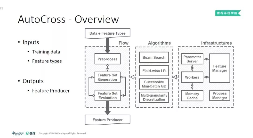从左往右看,AutoCross的输入是数据和对应的特征类型,然后经过AutoCross的Flow,输出一个特征生成器,能够把学到的特征处理方式应用于新数据。