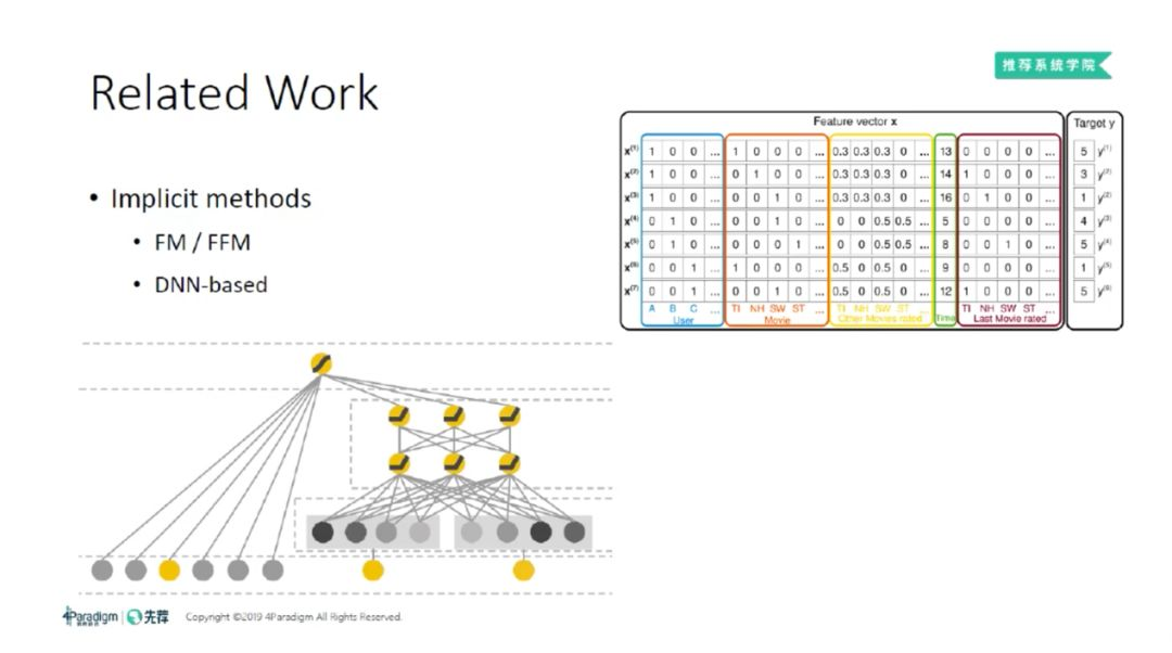 另外一类是隐式特征组合,大家可能更熟悉一些。FM[4]和FFM[5]是枚举所有的二阶特征组合,它们组合方式是用低维空间中的内积去代表两个特征的组合,取得了很好的效果。随着DL的兴起,现在更流行基于DNN做隐式特征组合。但是它的可解释性不强,一直被大家诟病。