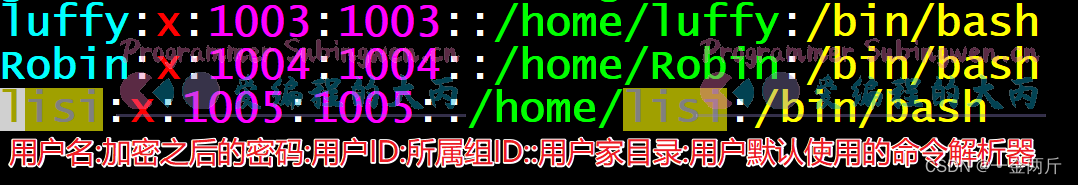 当新用户添加完毕之后,我们可以切换到新添加的用户下,用来检测是否真的添加成功了,另外我们也可以使用其他方式来检验,首先在 /home 目录中会出现一个和用户名同名的目录,这就是新创建的用户的家目录,另外我们还可以查看 /etc/passwd 文件,里边记录着新添加的用户的更加详细的信息: