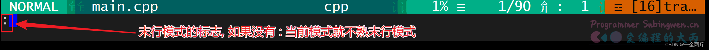 从命令模式切换到末行模式只需要在键盘上输入一个 :,同时这个符号也会出现在窗口的最下端,这时候我们就可以在最后一行输入我们执行的命令了。
