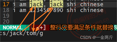 替换对应的命令是 s 并且可以给其指定参数,默认情况下只替换相关行的第一个满足条件的关键字, 如果需要整行替换需要加参数 /g。