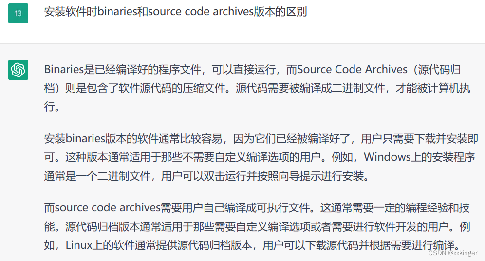 2、关于binaries或者source code archives版本的区别,被chatGpt回答的明明白白的,所以对于我们小白来说选择binaries版本就好啦。