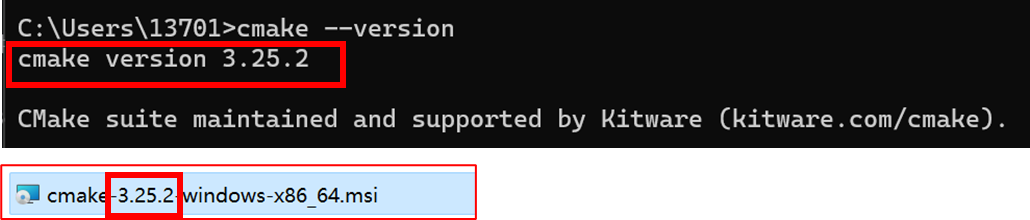 9、测试是否安装成功,打开终端(win+R快捷键然后输入cmd回车),输入 cmake --version后,出现下载的版本号即代表安装成功。