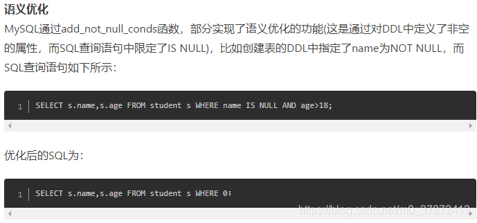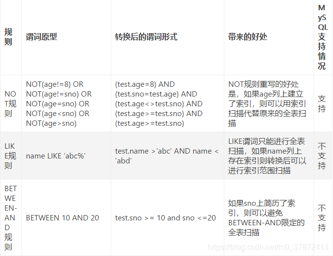 关于MySql如何对语法树进行优化,可以参考这篇文章(MySql内部如何优化SQL语句),在查询优化器中,分别讲述了逻辑优化和物理优化的规则,包括MySql遇见关键字like、group by、函数等优化的规则,下面是一些例子:
