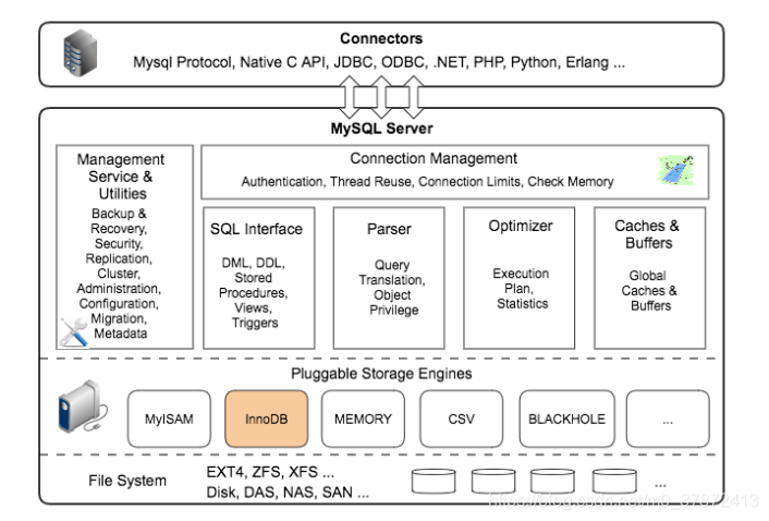 MySQL架构可以在多种不同场景中应用并发挥良好作用。主要体现在存储引擎的架构上,插件式的存储引擎架构将查询处理和其它的系统任务以及数据的存储提取相分离。