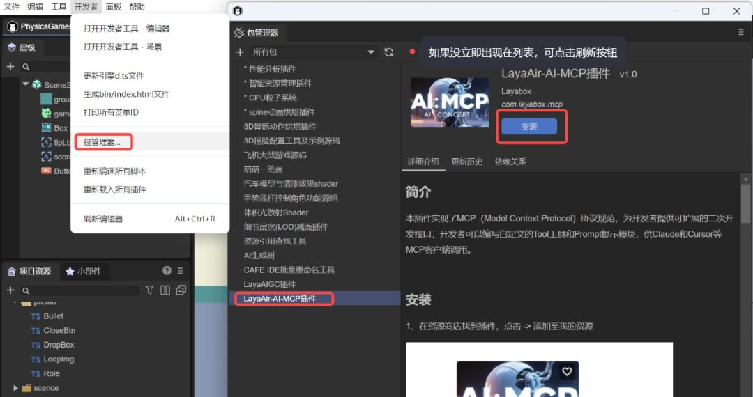 2、启动 LayaAir-IDE 3.2.5,依次点击菜单栏 开发者 -> 包管理器,找到并安装添加的MCP插件。