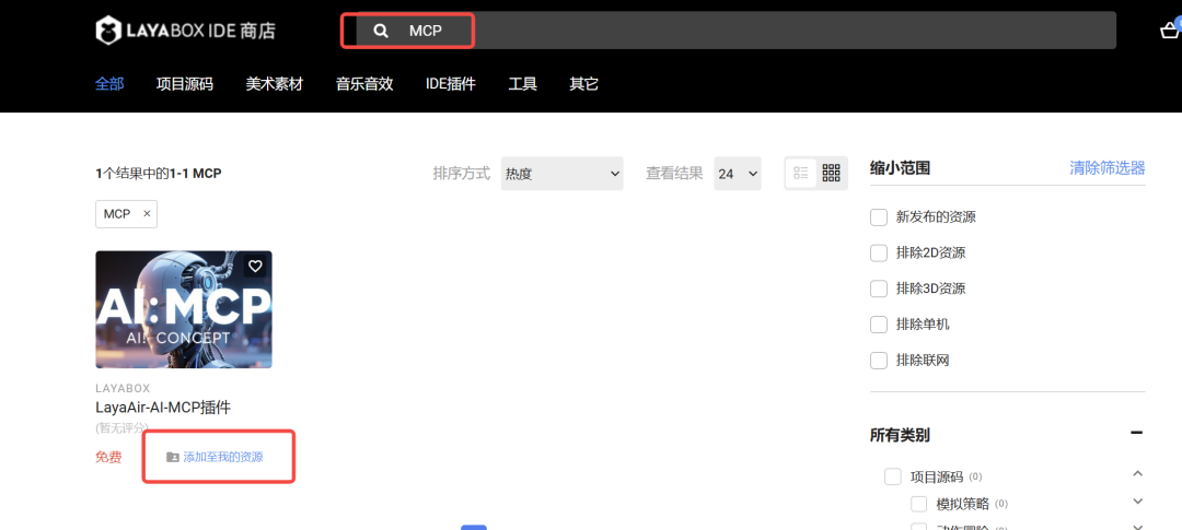 1、打开资源商店,搜索关键词 "MCP",将引擎官方MCP插件添加至我的资源。