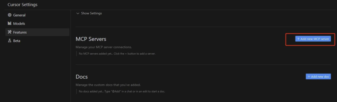 例如 Cursor 配置里,先在 Cursor Setting 中找到 Features,下滑找到 MCP Servers,点击Add new MCP Server。
