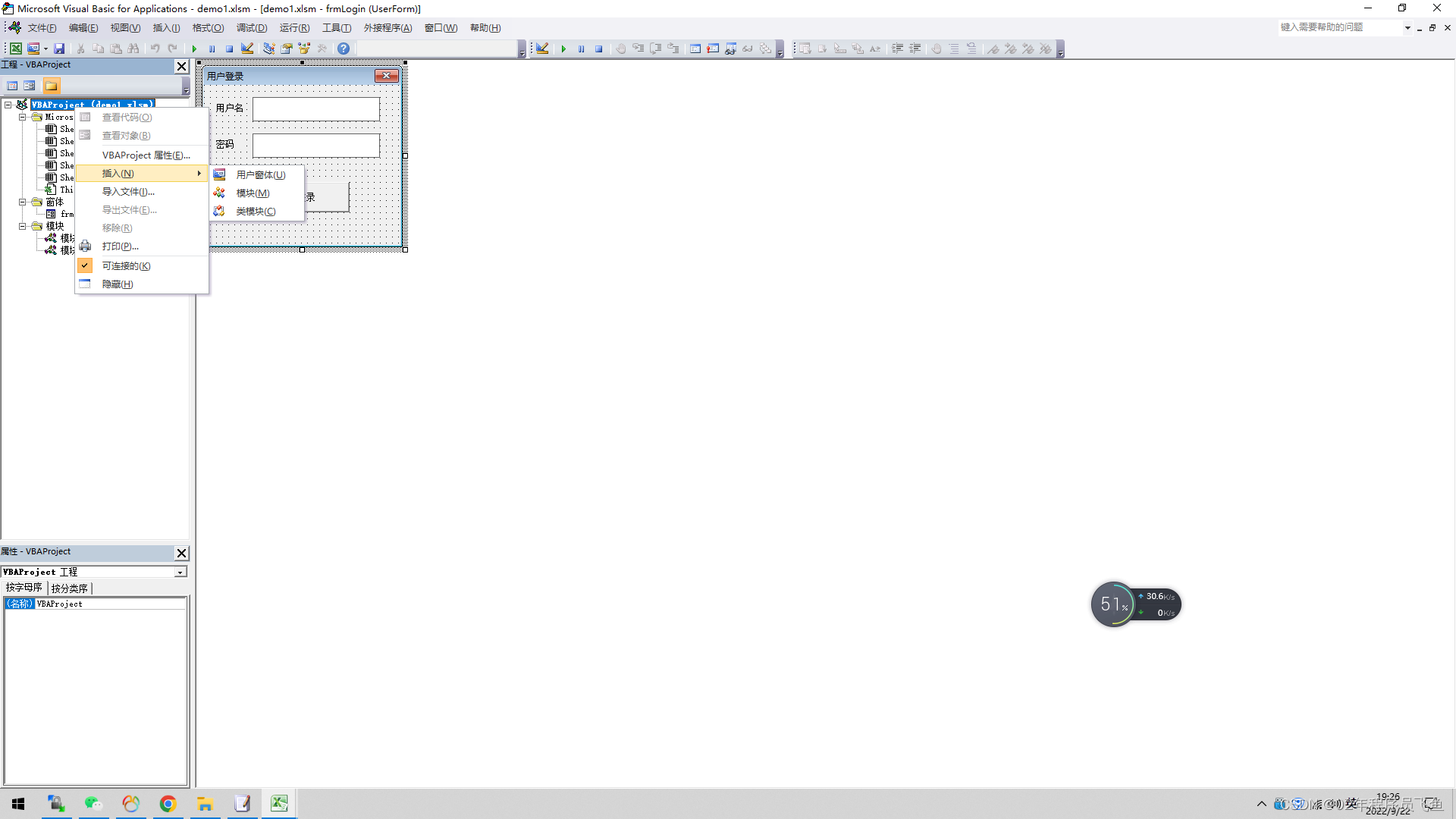 在代码编辑环境中,选中当前工程,右击鼠标就会出现如图所示的界面,然后依次选择”插入“--”用户窗体“菜单就可以了。