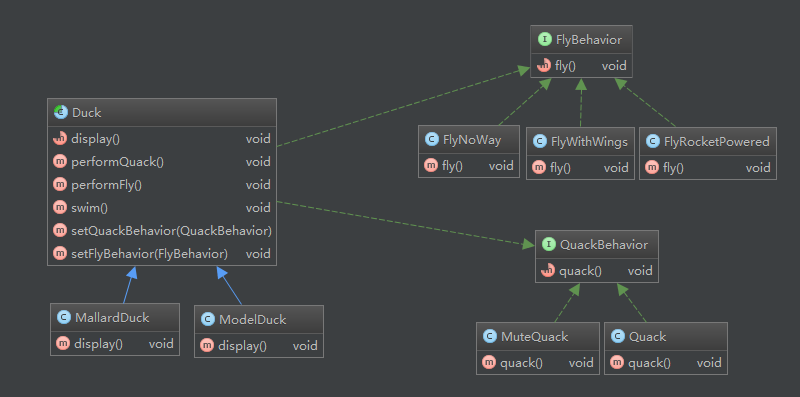 对于上面的系统,系统中变化的部分是鸭子这个主体,以及鸭子都会游泳,因而我们可以将其放在一个超类中。变化的部分主要是不是所有的鸭子都会飞,也不是所有的鸭子都会叫。那么我们可以将变化的部分抽离出来,但是我们也不能只是单纯的声明一个Fly类来表示鸭子是否会飞,因为鸭子飞行的方式有可能不同,比如火箭鸭就可以进行喷气式飞行;同理,并不是所有的鸭子的叫声都是一样的,有的鸭子发出的声音是“吱吱吱”,有的则发出“呱呱呱”的叫声。这里我们就使用到了策略模式,我们可以定义一种表示飞这种行为的接口,并且可以定义一种表示叫这种行为的接口。对于飞这种行为,则可以有多种实现,比如不会飞行,简单的飞行和喷气式飞行;对于叫这种行为,可以定义不会叫,“呱呱叫”和“吱吱叫”三种实现。最后我们这两组算法族的接口的实例通过组合的方式分别封装到鸭子主体中,表示这个鸭子具有飞和叫这两种行为。这里鸭子主体是一个抽象类,而具体的鸭子则在其实现中,并且在具体的鸭子实现中对鸭子的具体以某种方式飞行和以某种方式叫来进行定制,这样就可以产生出一个独有特征的鸭子类型。