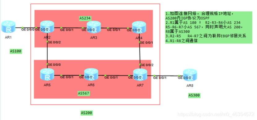 1.如图连接网络,合理规格IP地址,AS200内IGP协议为OSPF