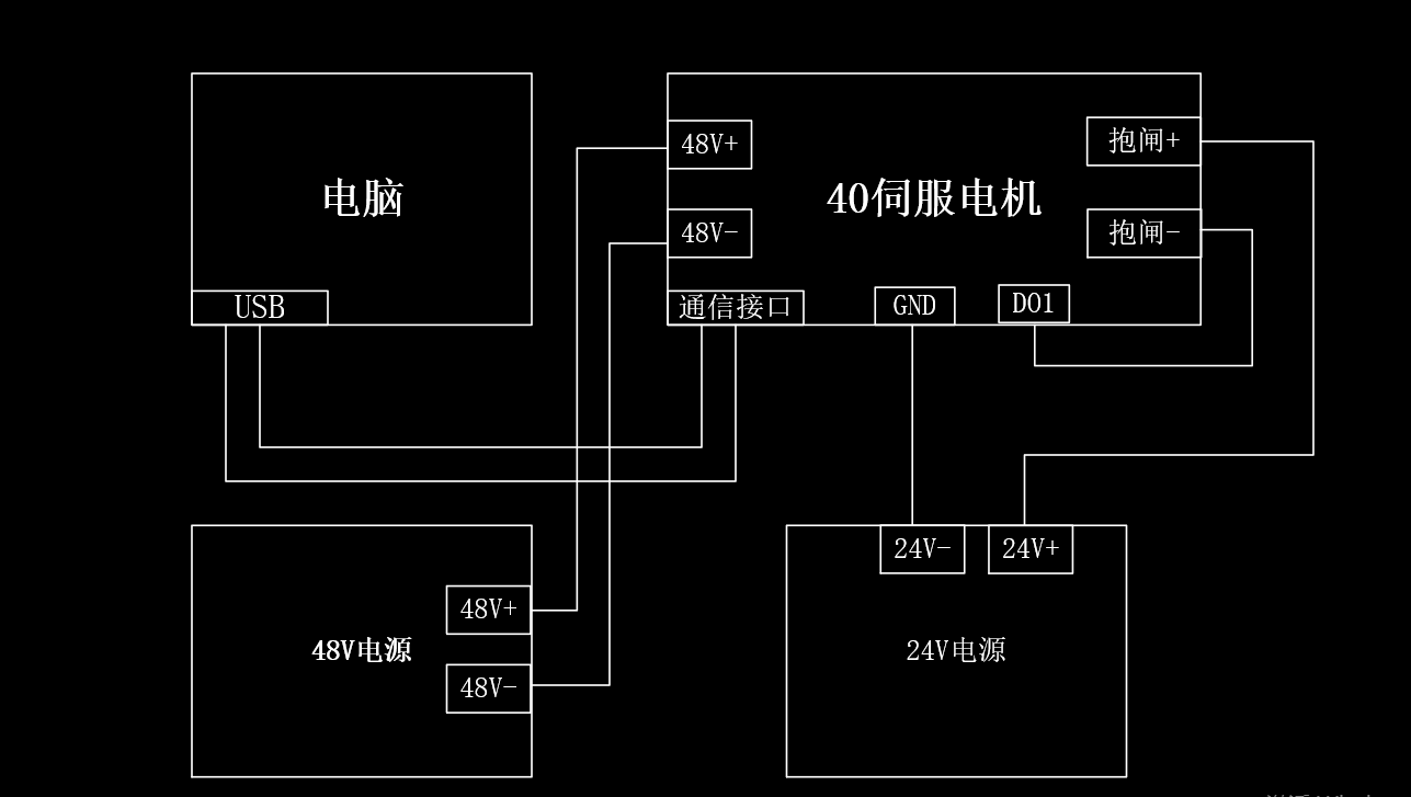 接线主要分为一下几部分电源给电机供电部分,电机与电脑上位机连接部分,以及抱闸控制部分,如下图所示: