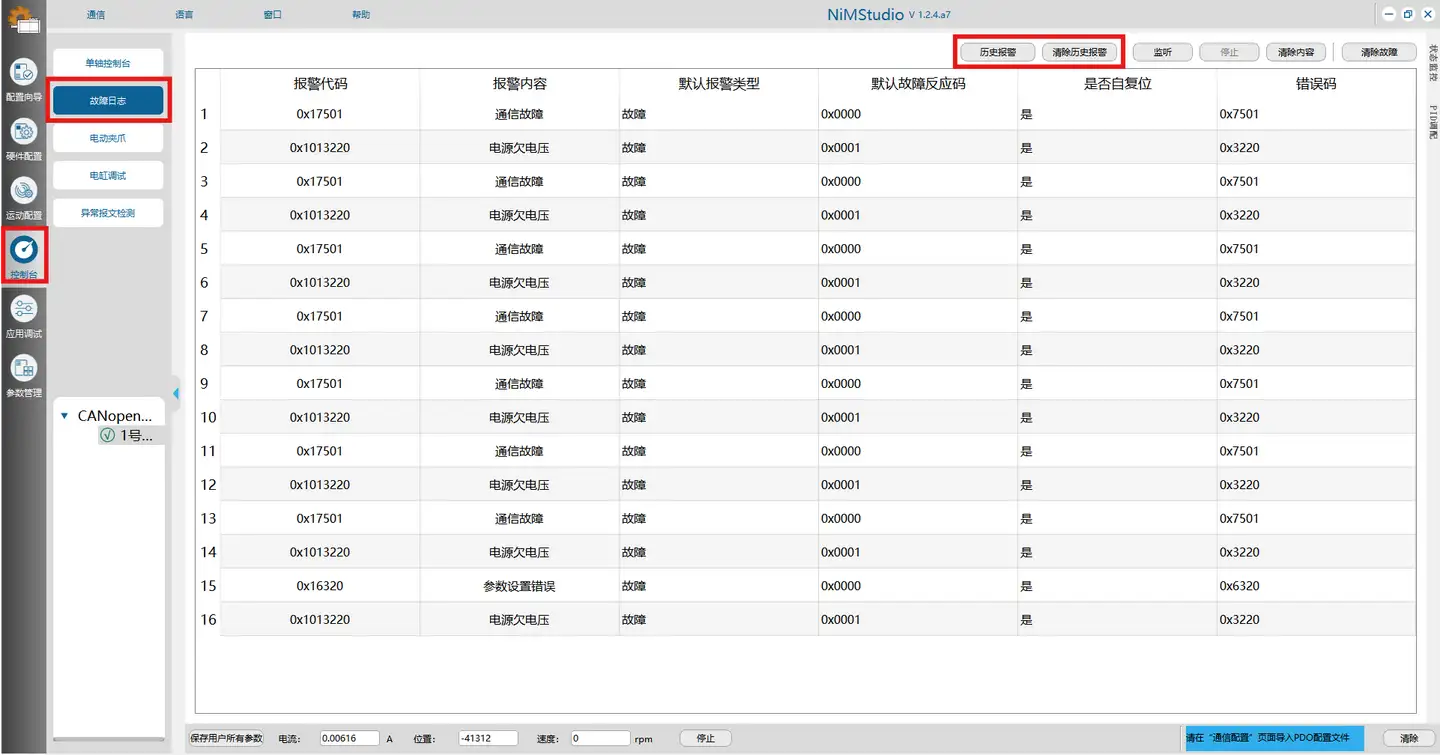 方式一——使用NIMstudio软件查看电机历史报警和当前报警: