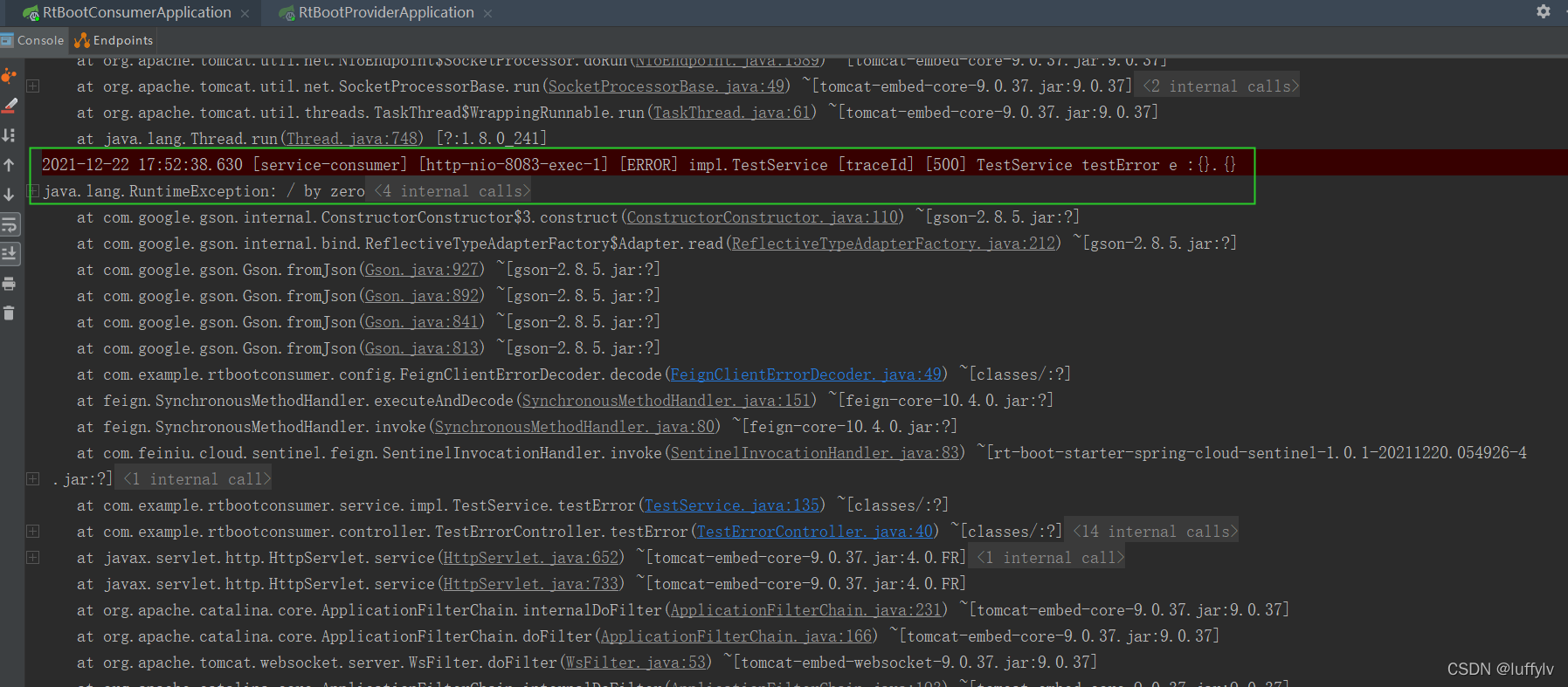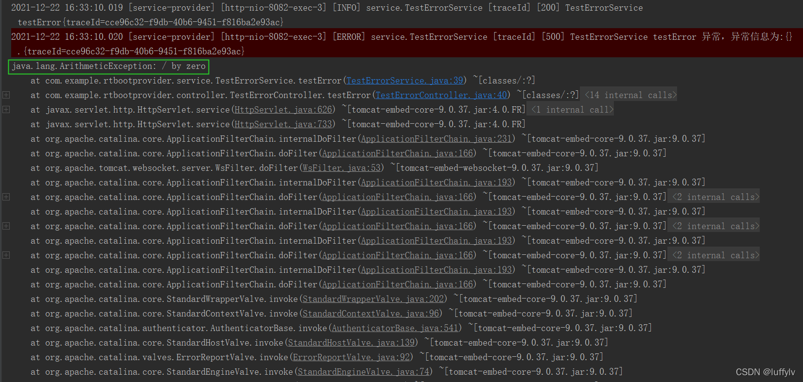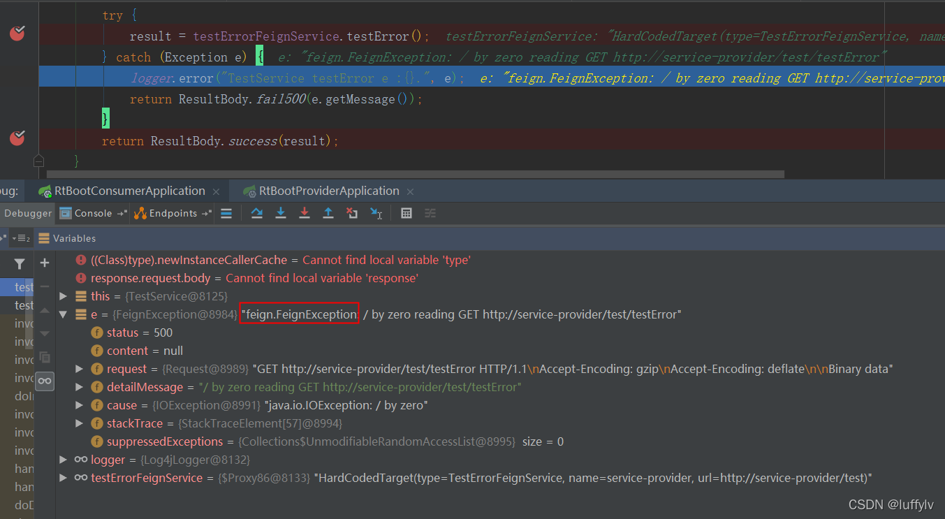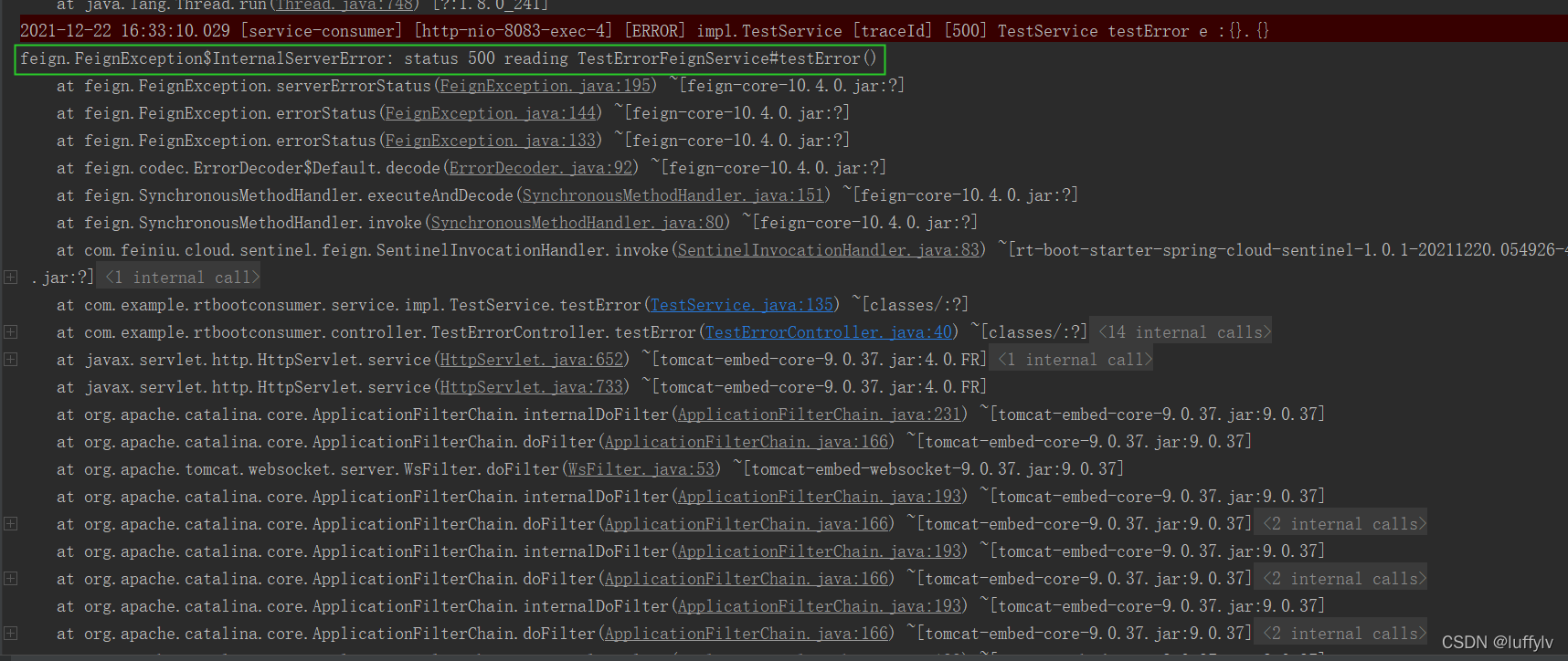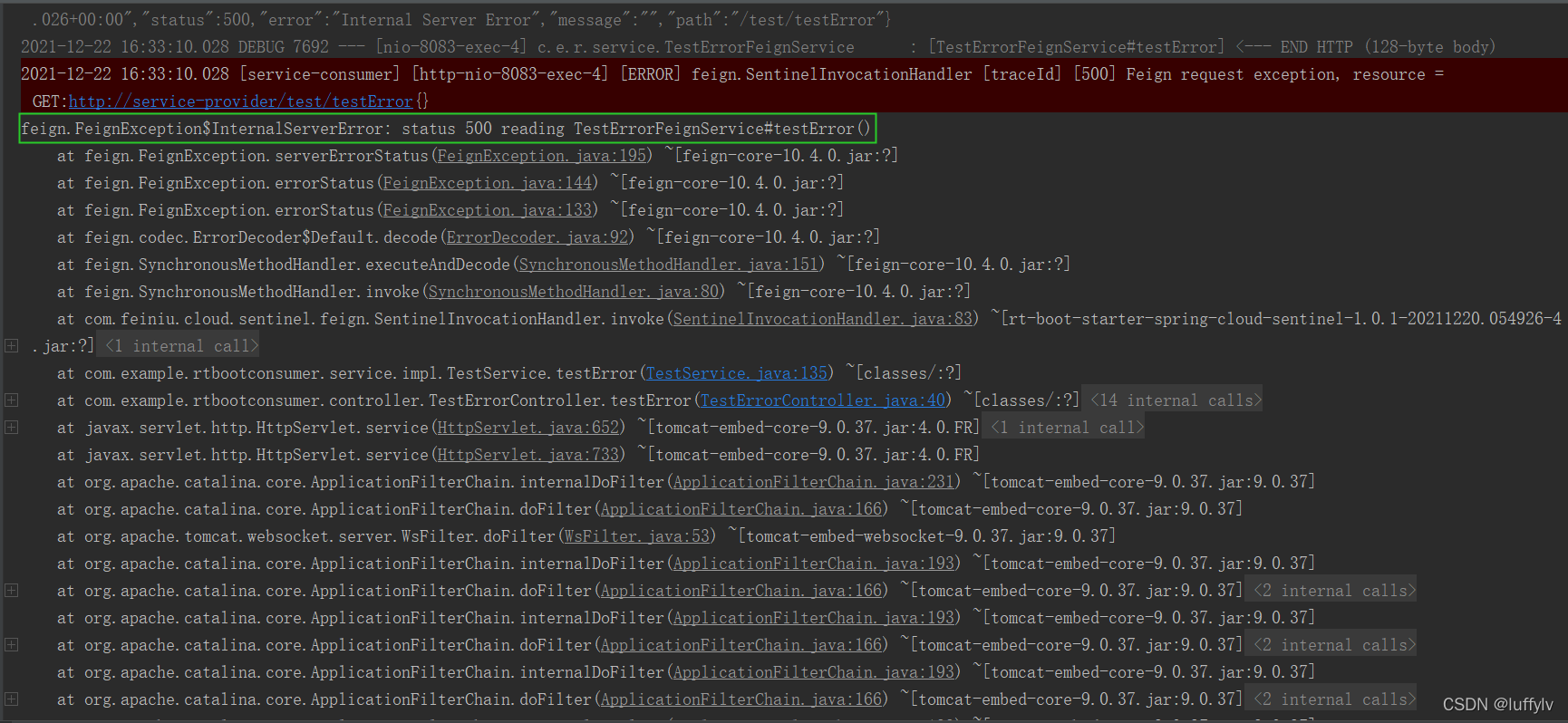 通过上面日志可以看出,服务端日志显示是算数异常并且告诉我们是因为 / by zero。但是查看客户端打印的日志发现,捕获并打印的异常信息是feign.FeignException$InternalServerError: status 500 reading TestErrorFeignService#testError()。通过客户端的异常信息我们只知道客户端通过OpenFeign调用服务端的testError()方法异常,客户端产生的是状态码为500的FeignException。至于为什么会异常我们通过上述客户端日志无从得知,需要查看服务端日志。很明显这并不能满足我的需求。