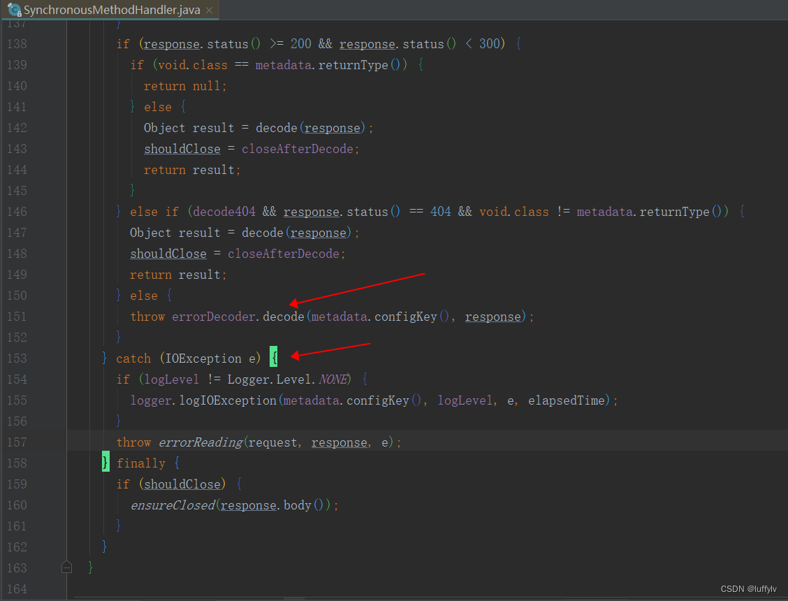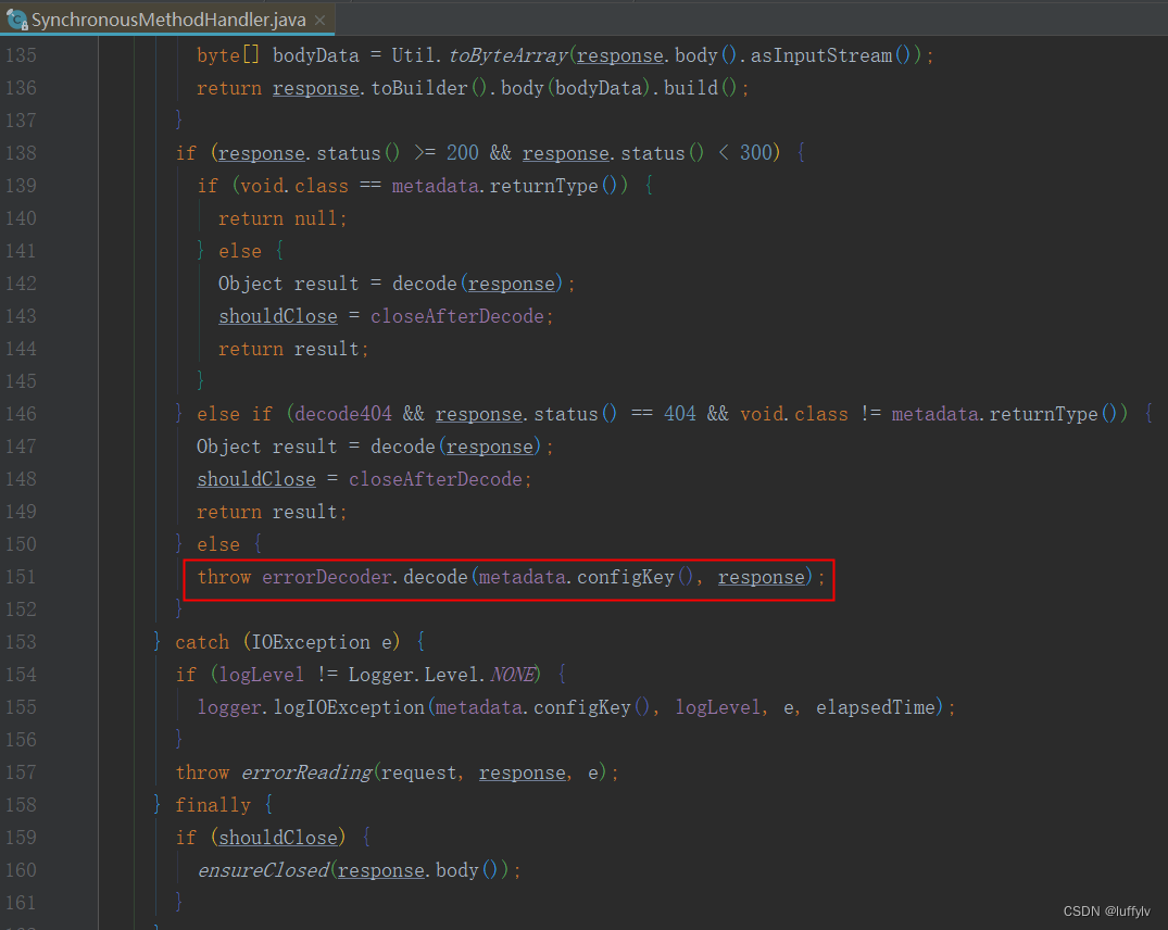 同样是该方法,从第138行到152行是对返回结果feign.Response的一个处理。可以看到,如果该结果不满足(response.status() >= 200 && response.status() < 300)且(decode404 && response.status() == 404 && void.class != metadata.returnType())时,会通过错误解码器进行解码,该方法会返回一个异常,然后抛出。如下图。