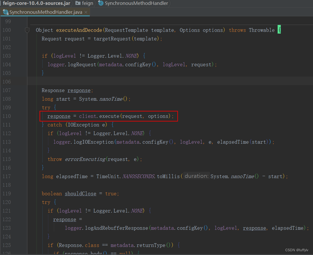 在解决该问题之前,我们首先要知道通过OpenFeign调用服务端接口异常的话是如何处理的。SynchronousMethodHandler->executeAndDecode这个方法第110行是真正调用服务端方法并返回一个feign.Response。如下图