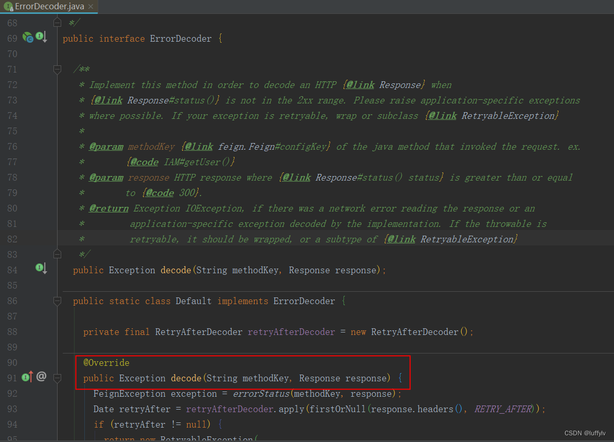 OpenFeign提供了一个接口ErrorDecoder,该接口只有一个抽象方法decode,默认情况下是使用其静态内部类Default的decode方法对于Response的status不在2xx范围的HTTP进行解码的。如下图