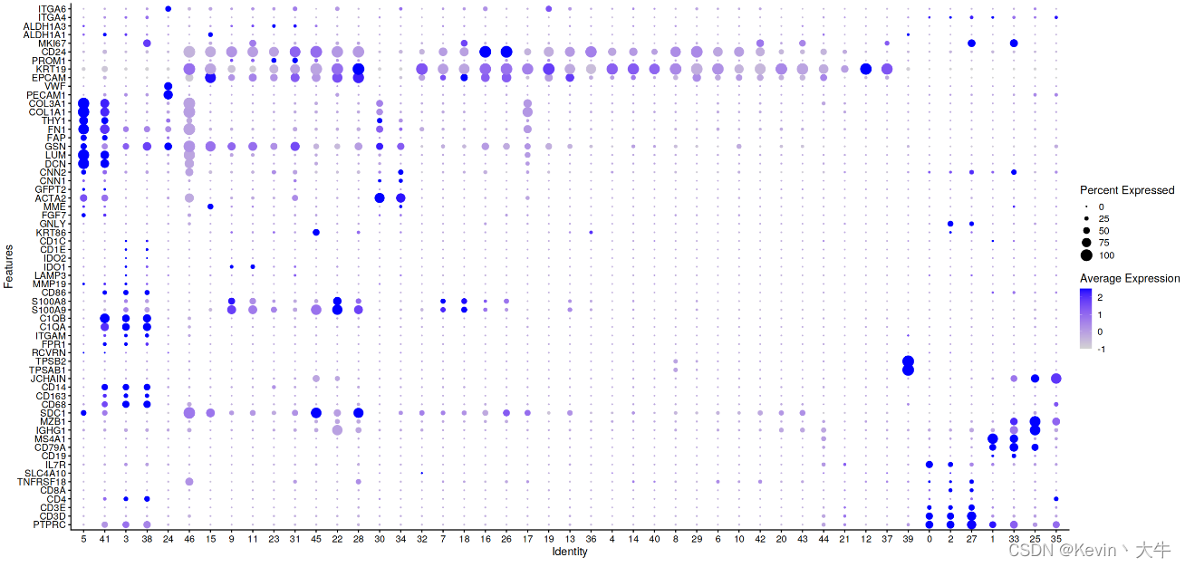 genes_to_check = c('PTPRC', 'CD3D', 'CD3E', 'CD4','CD8A','TNFRSF18','SLC4A10','IL7R', 'CD19', 'CD79A', 'MS4A1' , 'IGHG1', 'MZB1', 'SDC1', 'CD68', 'CD163', 'CD14', 'JCHAIN', 'TPSAB1' , 'TPSB2', 'RCVRN','FPR1' , 'ITGAM' , 'C1QA', 'C1QB', 'S100A9', 'S100A8','CD86', 'MMP19', 'LAMP3', 'IDO1','IDO2', 'CD1E','CD1C', 'KRT86','GNLY', 'FGF7','MME','ACTA2','GFPT2','CNN1','CNN2', 'DCN', 'LUM', 'GSN' , 'FAP','FN1','THY1','COL1A1','COL3A1', 'PECAM1', 'VWF', 'EPCAM' , 'KRT19', 'PROM1', 'CD24','MKI67', 'ALDH1A1', 'ALDH1A3','ITGA4','ITGA6') DotPlot(BRCA_SingleCell.T,group.by = 'seurat_clusters', features = unique(genes_to_check),cluster.idents = T) + coord_flip()结果如下: