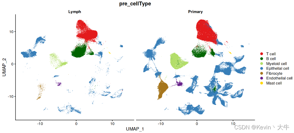 展示不同组织细胞类型的UMAP图,可以发现两个组织之间的细胞浸润是存在差异的,于是我们针对这个现象进行统计分析