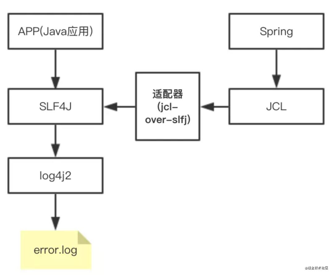 这就是为了对slf4j的适配做一个例子说明。Spring是用JCL作为日志门面的,那我们的应用是slf4j + logback,怎么让Spring也用到logback作为日志输出呢?这样的好处就是我们可以统一项目内的其他模块、框架的日志输出(日志格式,日志文件,存放路径等,以及其他slf4j支持的功能) 很简单,就是加入jcl-over-slf4j.jar就好了。我又盗了一个图来说明