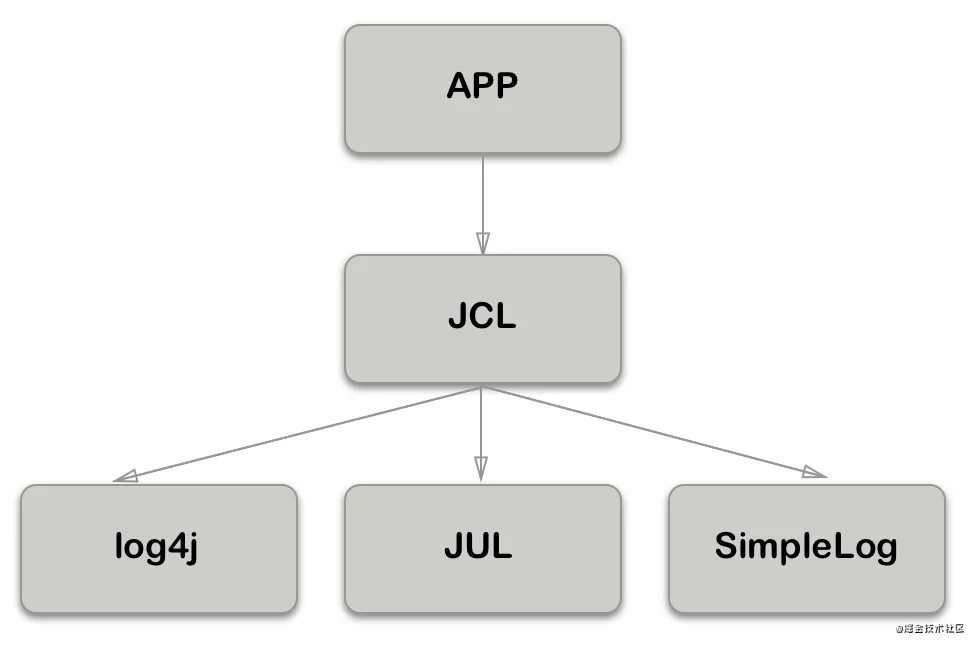 4.Apache见此,开发了JCL(Jakarta Commons Logging),即commons-logging-xx.jar。它只提供一套通用的日志接口api,并不提供日志的实现。很好的设计原则嘛,依赖抽象而非实现。这样应用程序可以在运行时选择自己想要的日志实现组件。