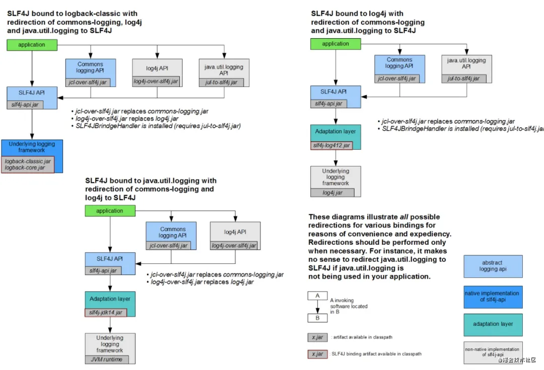 图的意思为如果你想用slf4j作为日志门面的话,你如何去配合使用其他日志实现组件,这里说明一下(注意jar包名缺少了版本号,在找版本时也要注意版本之间是否兼容)