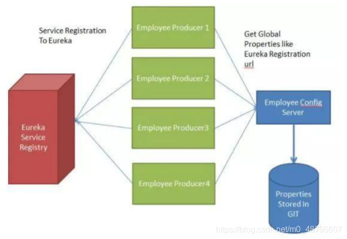 下面的例子中多个员工生产者模块从Employee Config Module获取Eureka注册的财产