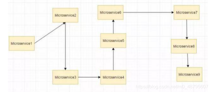 在微服务中,通常根据业务模块分服务,项目中前端发起一个请求,后端可能跨几个服务调用才能完成这个请求(如下图)。
