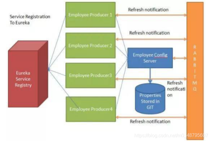 如果假设GIT中的Eureka注册属性更改为指向另一台Eureka服务器,会发生什么情况。在这种情况下,我们将不得不重新启动服务以获取更新的属性。还有另一种使用执行器端点/刷新的方式。但是我们将不得不为每个模块单独调用这个url。例如,如果EmployeeProducer1部署在端口8080上,则调用http:// localhost:8080/refresh。同样对于Employee Producer2 http://localhost:8081/refresh等等。这又很麻烦。这就是Spring Cloud Bus发挥作用的地方。