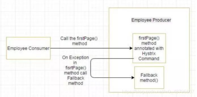 假设如果上图中的微服务 9 失败了,那么使用传统方法我们将传播一个异常。但这仍然会导致整个系统崩溃。 随着微服务数量的增加,这个问题变得更加复杂。微服务的数量可以高达 1000.这是 hystrix 出现的地方 我们将使用 Hystrix 在这种情况下的 Fallback 方法功能。我们有两个服务 employee-consumer 使用由 employee-consumer 公开的服务。简化图如下所示